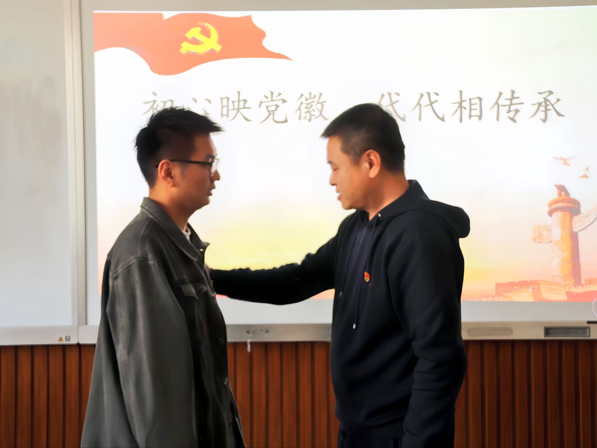 会议严格按照党组织接收预备党员的程序进行,经核实与会人数后,全体起立面向党旗,共唱国际歌,大会正式开始。随后,入党介绍人石勇、潘腾宇分别介绍乔玥等11名同志的教育和培养过程、日常表现情况,同意接收乔玥等11名同志为中共预备党员。石勇代表支部委员会进一步对他们较强的实践能力和理论素养、良好的工作态度与群众基础给予高度评价,表示他们的发展程序符合规范,已具备成为中共预备党员的条件,经党支部委员会讨论决定,同意乔玥等11名同志加入党组织。与会党员进行讨论,以无记名投票的方式进行表决,全票同意接收乔玥等11名同志入党。11名预备党员依次上台,由正式党员为其佩戴党徽,这不仅是党员身份的象征,更是责任的担当与使命的传递。石勇对新接收的预备党员寄予厚望,激励他们以孔繁森等模范党员为榜样,在工作中时刻铭记自身党员身份、牢记党员使命,以饱满的热情投身于各项工作。在潘腾宇的领誓下,全体党员面向党旗庄严宣誓,铿锵有力的誓词展现对党的忠诚和为共产主义事业奋斗终身的坚定信念。