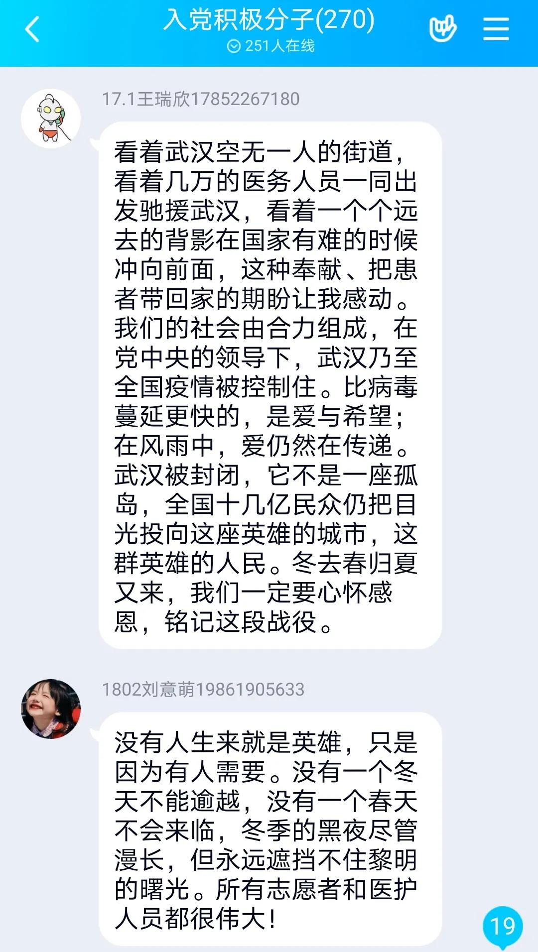 在太阳集团网tyc9728学生党支部宣传委员纪楠的主持下,太阳集团网tyc9728全体入党积极分子齐聚一“群”,开展电影党课。党课以线上观看抗疫纪录片《英雄之城》为主要内容,让学生充分表示对党中央始终把人民群众生命安全和身体健康放在第一位的认同和拥护,字里行间透漏着对疫情中党员们冲锋陷阵、不怕牺牲、勇于担当精神的敬佩。党课最后,纪楠总结道:“抗击疫情,每个人都是抗击疫情链条上的一环,关键时刻,只有建立起政府、社会、个人各方休戚与共,有机互动的命运共同体,才能共克时艰。”
