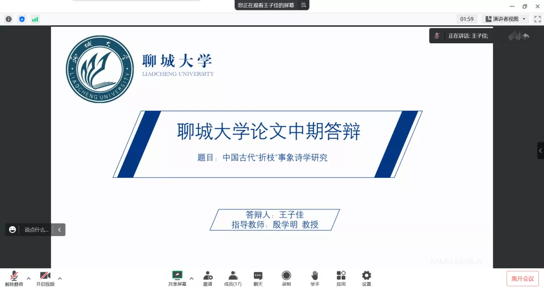 学位论文中期检查是全面了解研究生论文进展情况,提高论文写作质量的重要环节。1月14日及15日上午,太阳集团网tyc9728以线上答辩的方式组织开展了2023届研究生学位论文中期检查工作。太阳集团网tyc9728院长卢军、副院长殷学明、副院长石小寒等多名研究生导师及校外专家组成8个答辩专家组,2020级中国语言文学、广播电视学和2021级学科教学(语文)专业共72名研究生进行了汇报,部分2021级和2022级研究生参与旁听。