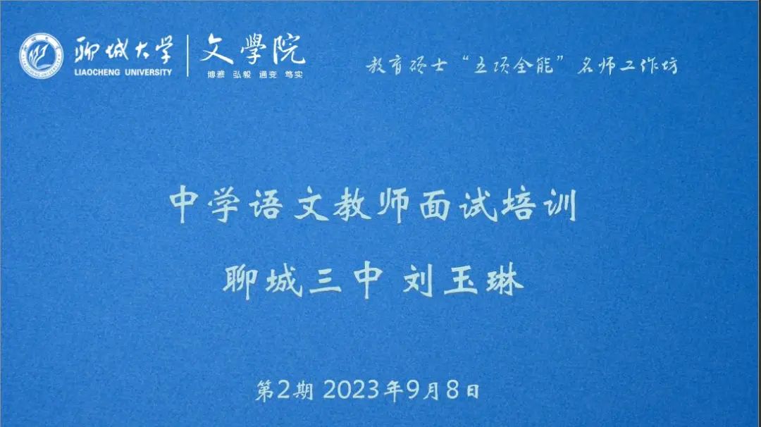 我院于9月8日特邀聊城三中刘玉琳老师做客“教育硕士‘五项全能’名师工作坊”第2期,为2022级学科教学(语文)专业研究生做 “中学语文教师面试培训”的主题讲座。