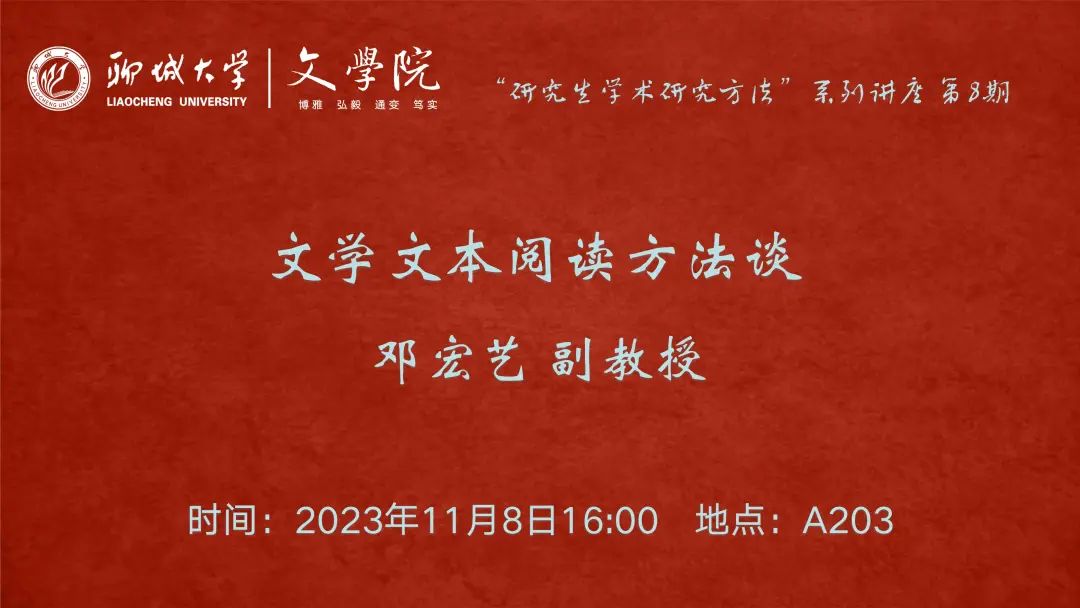 为提高研究生学术素养,掌握学科领域的基础方法。我院于11月8日邀请邓宏艺副教授做客“研究生学术研究方法”系列讲座第八讲,为2022级、2023级中国语言文学专业研究生开展题为《文学文本与理论文本的阅读》的学术讲座。