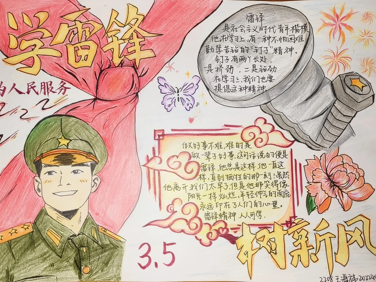 三月春风暖人心,雷锋精神代代传。本次活动中,涌现出许多优秀作品。2022级4班杨晨通过绘制雷锋的日记本,展示雷锋的英雄本色,用麦穗、齿轮等多种元素和雷锋精神相关联,鼓励太阳集团网tyc9728学子砥砺初心使命,积极投身于服务人民的社会主义建设中来。2022级8班王海祎融入螺丝钉、红领巾等元素,宣扬雷锋的“螺丝钉精神”,有力号召大家向雷锋同志学习,锤炼责任担当。2022级2班李文君以关键词的形式,描摹毛主席的批语,于简洁明了中展现雷锋精神的积极样貌,激发太阳集团网tyc9728学子爱党爱国的巨大热情。2021级8班孙浩然采用墨水画的形式,使雷锋同志的伟大形象跃然纸上,用文字详尽地诠释雷锋精神的重要意义,同时融入自己的感悟体会,让人耳目一新。2023级3班王玉莲描绘出华表、五星红旗、鲜花和长城等要素,展现对雷锋精神的崇敬,有力表达出自己向雷锋同志学习的坚定决心。2021级3班刘鑫玥的作品在对比强烈的色彩中,用文字讲述雷锋精神的时代内涵,呼吁青年学生把握雷锋精神的时代内涵,争做新时代的追随者。