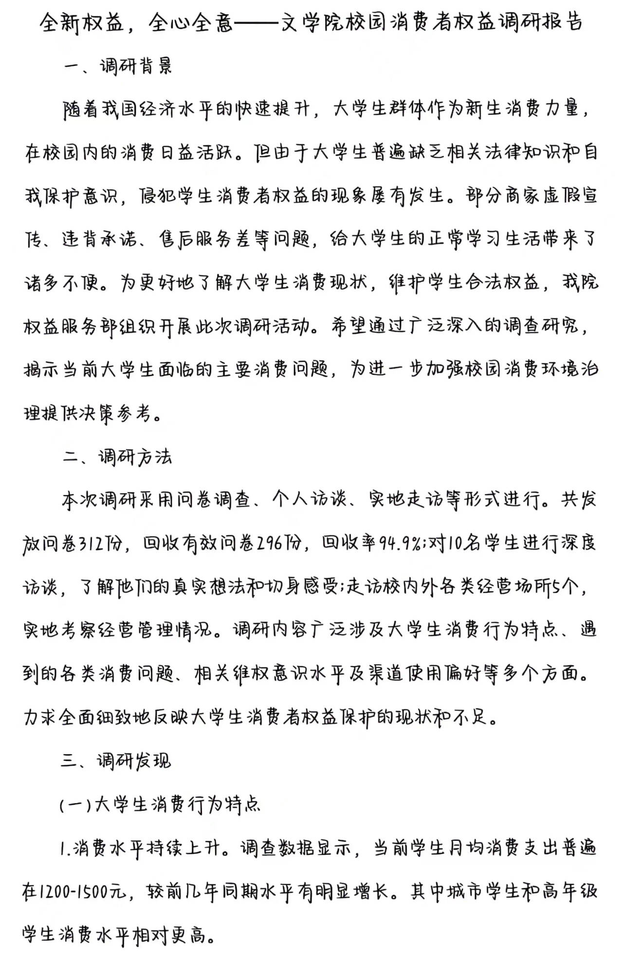 权益维护无小事,校园和谐靠大家。此次调研实践活动的成功举办在宣传消费者权益保护知识,提高同学们维权意识的同时,有利于引导同学们理性消费、健康消费,构建和谐消费环境,助力学生权益保护工作持续健康发展。(通讯员 刘琪 王淑婷 王彦天 审核 相萌萌 王淑婷)