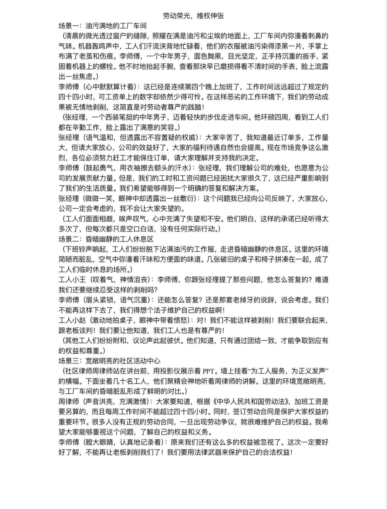 劳动最光荣,维权不可忘。本次劳动维权微剧本征集活动在保障劳动者合法权益,培养学生法治观的同时,有利于构建和谐劳动关系,体现劳动尊严和法治正义,共同营造公平、正义、和谐的社会氛围。(通讯员 王淑婷 刘琪 张斯文 刘馨仪 审核 相萌萌 王淑婷)