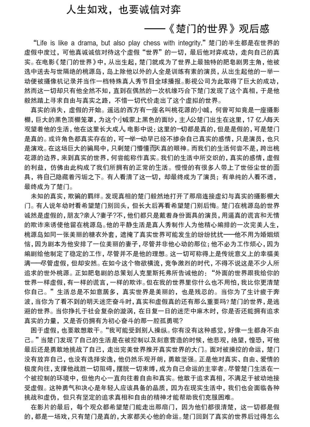 影片《楚门的世界》主要讲述了主人公楚门从小生活在巨大的摄影棚里,但他对此一无所知,在得知这虚假的一切以后,楚门决定追求自我的故事。楚门对抗被设定生活的举动、积极向上的人生态度、追求自由的努力进取令同学们受益匪浅,大家感慨万千,纷纷将心得感悟融入字里行间。2021级2班周宇就电影内容对“欺骗的危害和诚信的力量”这一主题进行深刻剖析,结合社会实际阐释诚信对社会国家的重要意义,号召当代青年规范自身,诚实守信。2021级3班吕欣洁将对楚门的理解与自身经历进行比对,用细腻的文字表达自己对自我和真实的追求,表明自己会树立正确的道德观念,实践诚实守信的行为准则,彰显其独特的思考与体验。2022级8班苏箐以台词“人生如戏,也要诚信对弈”入题,将影片内容和自身感悟紧密结合到一起,从微小处窥见大道理,传达诚实守信的强大力量,振奋心魄,引人共鸣。