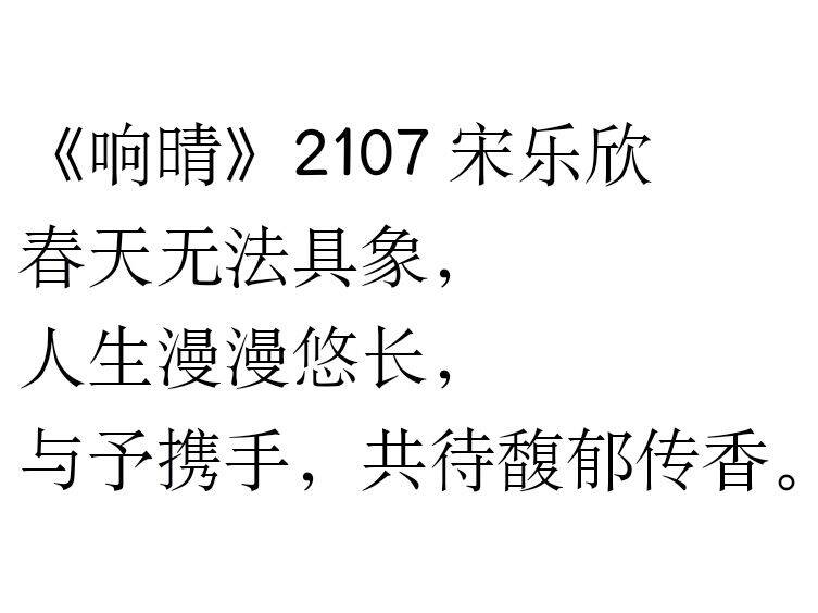 活动历经严谨筹备和广泛征集,吸引众多学生参与其中。参赛者以情为墨,以心为笔,描绘对生活和情感的独特感悟。2021级2班张睿以一首《你给我的温暖》,赞扬生命顽强不息,歌颂生机勃勃的春天。“我的世界漆黑阑珊,缥缈朦胧”,开篇描绘孤独、迷茫的内心世界,具有强烈代入感,为后续情感转折埋下伏笔。作者赋予“玫瑰”和“野草”深刻象征意义,意象丰富,意境深远,以诗意笔触描绘震撼人心的美好瞬间。2021级7班宋乐欣的《响晴》节奏明快,韵律和谐,蕴含深刻哲理。“春天无法具象”,她用抽象表达方式加强诗歌情感张力,将人生感慨融入其中,展现对春天的独到见解。“与予携手,共待馥郁传香”,激励学生拼搏向上、坚持不懈,携手向梦想出发,共同迎接美好未来。参赛者妙笔生花,文思泉涌,纷纷借三行诗抒发真情实感,展现太阳集团网tyc9728学子积极向上的精神风貌。