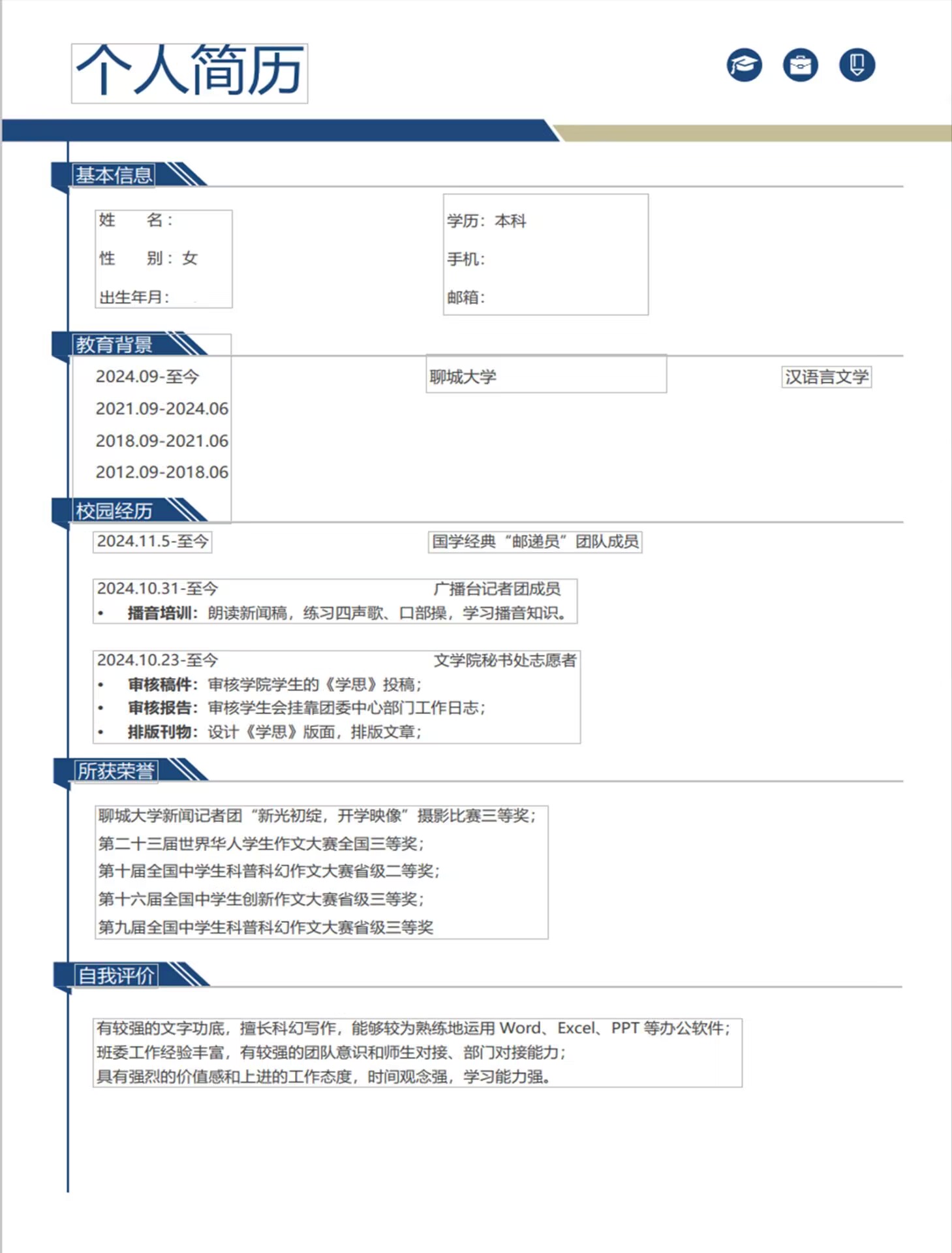 本次比赛秉持“促进就业、模拟实战、提高实效”的原则,旨在为同学们构建一个学习、交流和展示才华的平台。参赛同学结合自身特长,在简历中展现独特风采。徐美娟以明晰的职业目标为导向,凭借丰富的实习经历和扎实的文化素养,有效展现自身竞争优势。在自我评价中,她进一步阐述自身的职业规划蓝图以及对行业的深刻理解,字里行间透露出对未来职业的热情与憧憬。吴琬莹的简历以简洁有力的语言,清晰展示其专业技能和项目经验,内容条理分明,设计美观大方,令人印象深刻。郝心梦则聚焦于自己的专业技能和综合素质,结合在校任职经历,详细描述自己在学术研究和团队合作方面的实践情况,其独特的创新实践经验与求职岗位高度契合,既突出个人的专业能力,也全面展现其作为未来职场新人的潜力和优势。