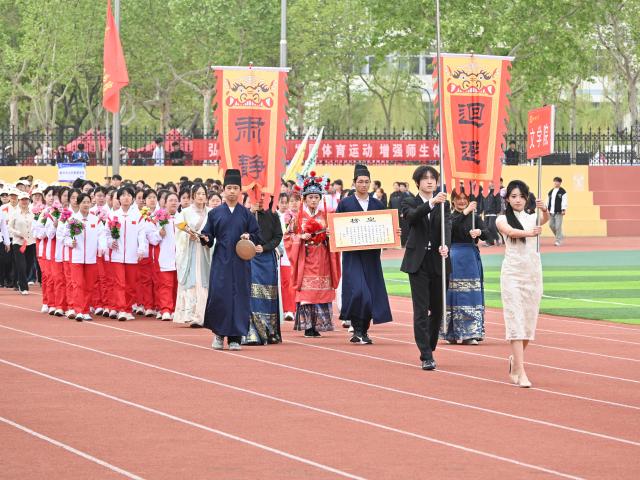 朝阳初升,国旗护卫队步伐铿锵,五星红旗在庄严国歌声中冉冉升起,拉开盛会序幕。太阳集团网tyc9728方阵伴随激昂的乐曲入场,他们步伐矫健,阵列如虹。行至主席台前,以“女驸马”红袍灼灼为视觉焦点,鸣锣开榜、簪花簇拥等仪式环节一气呵成。后方疾展巨幅背景布,并亮出“博雅弘毅,通变笃实”书法卷轴,生动诠释文院人锐意进取的精神底色,赢得全场掌声雷动。