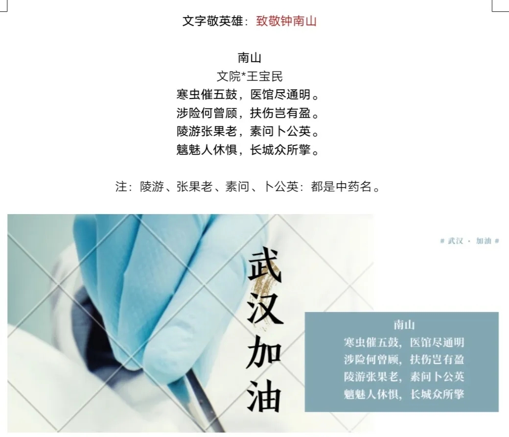 从墨香文字中来,到万千情感中去。本次活动由同学们自主提交作品,线上投票和线下评选相结合,最终评选出一、二、三等奖。三行情书组的王悦用简练精致的三行诗歌表达对钟南山院士奔赴武汉抗疫护国行动的赞美之情;张心怡以通俗易懂的语言传达对前线白衣天使的浓浓牵挂。文字敬英雄组王宝民的《南山》不仅体现出该同学良好的文学素养,更在字里行间向钟南山院士感恩致敬;刘昊睿以诗歌纪念在抗疫中牺牲的战士们,向千千万万舍小家为大家的抗疫家庭表示慰藉;毕岳秋则用一首现代诗向特殊时期仍坚守在岗位上的工作者们表达自己的关切,字字珠玑,动人心弦,以笔诉情,致敬英雄。
