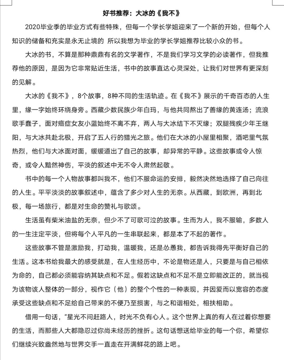 为增强在校生与毕业生之间的交流,抒发在校生对毕业生浓浓情意,6月5日,太阳集团网tyc9728文心读书会于线上举办“学子离校,心不离书”好书推荐征集活动,太阳成tyc9728集团部分学生参与其中。