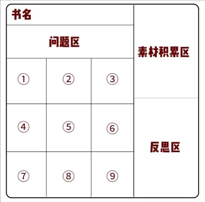 九宫格笔记法比较适合在读书时运用。由于一本书的知识点与关键词繁多,所以我们需要高效地记录。这种笔记方法大致分为三个区:问题区、素材积累区、反思区。当阅读时遇到不能理解的书中人物的行为或者情节时可将它记录下来,随后在后面的情节中寻找答案,也就是所谓“带着问题读书”。而素材积累区则可以记录下令你印象深刻的美文美句以及名人典故等。如果你在阅读后发现文章对你有所启迪,那么你可以在反思区写下你的感悟。