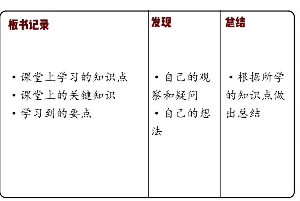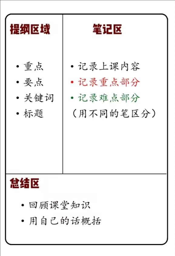 康奈尔笔记法也叫做5R笔记法。可以用于听课、阅读、复习和记忆材料,被誉为“最佳笔记系统”。这种笔记大概分为三个区域:提纲区域、笔记区、总结区。在提纲区域主要记录重点要点以及关键词和标题;在笔记区主要记录上课内容,记录重点部分,记录难点部分;在总结区主要回顾课堂知识。一份思路清晰,重点突出的笔记能够加深对知识的理解,更能高效地让你回想起知识。