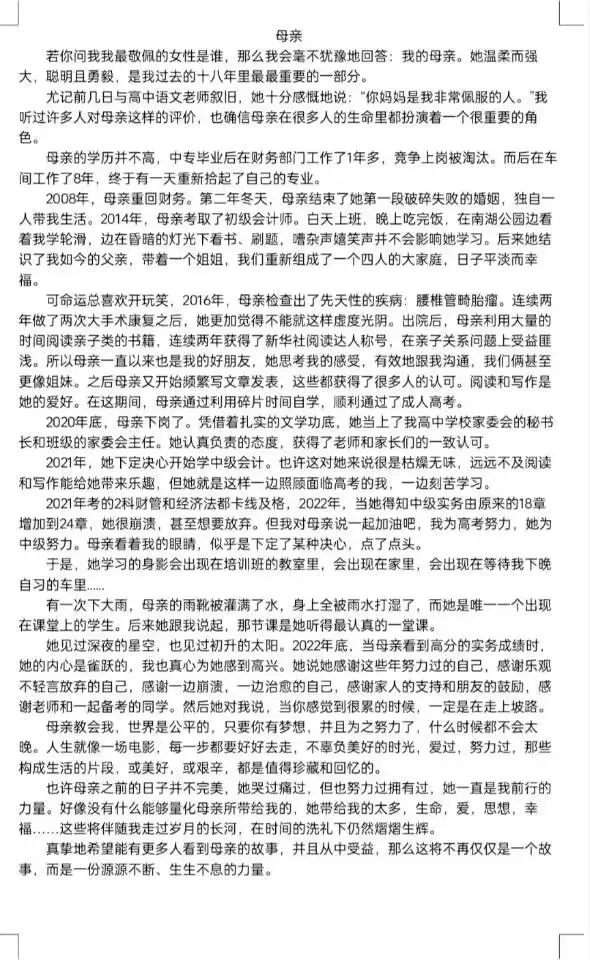 李一歌用颇具文言色彩的笔触,旁征博引,落笔成文,在“今朝云盛,光华遍燃”的女子佳节,感念“燃灯校长”张桂梅行于大山深处,为改变女孩们的命运而竭尽全力的身姿,写出“三尺讲台擎寓托之求学梦”“鹤发银丝,尽显丹心热血”的先生之德。刘文静以书信形式抒发情感,用寥寥几语,在时空对话中与曾经迷茫的自己畅谈远方。不辜负生活,不迷失方向,不负时光馈赠,在风华正茂的年纪,她并不盲目追求“成功女性”的标签,而是慢慢向更深处挖掘自我,寻找自己的独特风景。马明婧用淡淡的笔墨刻画了一个经历痛苦但不失温柔,面对绝境却永不放弃的女性形象:她的心虽然柔软,却有力量,以女性独有的坚韧的力量,坚定地一步一步走过痛苦的泥泞,走过岁月的洗礼,绽放属于自己的光彩。