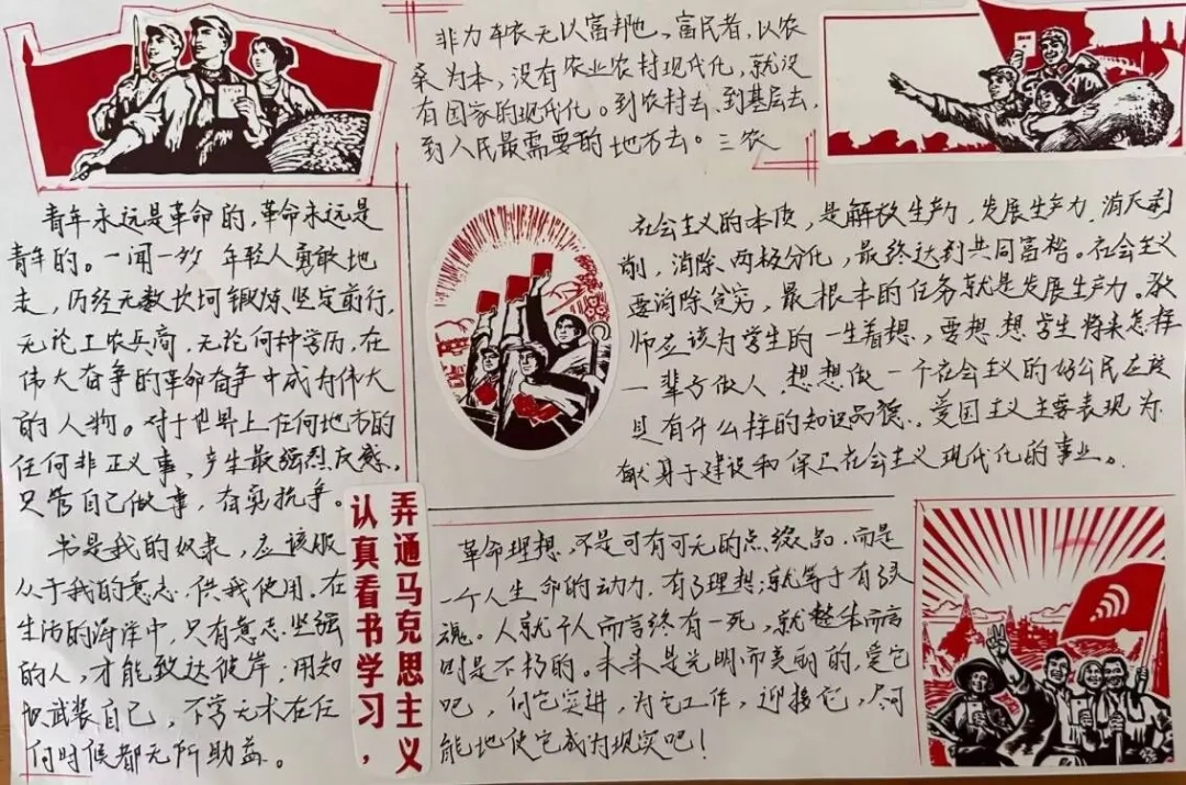 在众多优秀作品中,刘保汝用拼贴画绘制读书笔记,精心构图,选取《红岩》中经典段落,细读精读,进行分析与理解,反映出历史人物为国为民艰苦卓绝的奋斗精神。贾舒淇字迹娟秀,擘肌分理,标注清晰,深入了解《红玫瑰与白玫瑰》的创作背景,透彻分析书中具体内容,用心体会张爱玲“白月光与朱砂痣”的爱情观。周思琪围绕革命历史题材剧《觉醒年代》,图文并茂展现新文化运动、“五四运动”到中国共产党建立这段波澜壮阔的历史画卷,以及先进子追求理想的澎湃激情。一张张精致美观、内容丰盈的读书笔记,记载着同学们的读书热情与快乐,见证着同学们的收获,让同学们享受阅读,品味典籍。