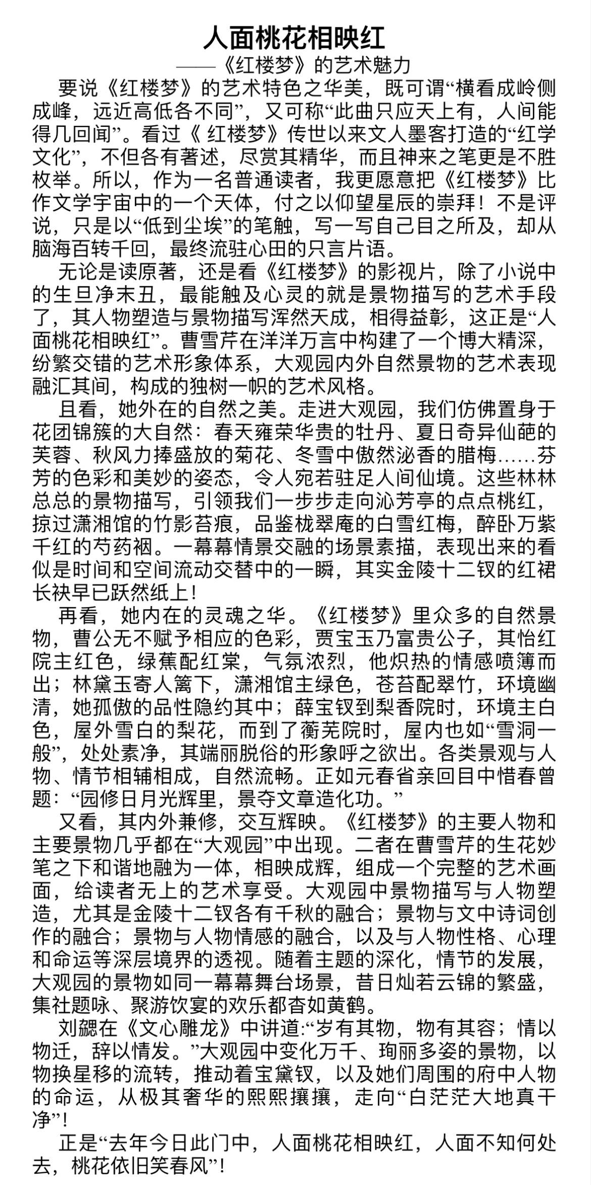 活动过程中,同学们认真准备,用心写作,众多优秀作品为同学们领略阅读力量、感受思考魅力提供借鉴。其中,2020级8班赵文端落笔成文,层次分明,以“人面桃花相映红”精准概括《红楼梦》情景合一的特点,透彻分析书中描写,通过精心举例和排比从外在自然之美、内在灵魂之华与内外兼修、交互辉映三个方面阐释曹雪芹独树一帜的艺术风格。2021级5班宁金泽从林冲、史进和鲁智深三位人物出发,设身处地体会英雄心理,结合古今感悟人生真谛。他谈到“用生活所感去读《水浒传》,用读《水浒传》所得去生活”,感慨自己不只是在读《水浒传》,更是在读人生,思想深刻,情感真挚。2021级3班李瑞瑶以时间为线,从“书之情,梦之幻”的儿时阅读到“书之志,镜之生”的少年阅读再到“书之理,路之长”的成人阅读,记录每个时段读书的不同心境与感受。文章以“愿校园之人都能轻启书卷,于春晓的苍林间,流尽华年”结尾,鼓励同学们层层阅读,含书之理,以期在人生路上熠熠生辉。