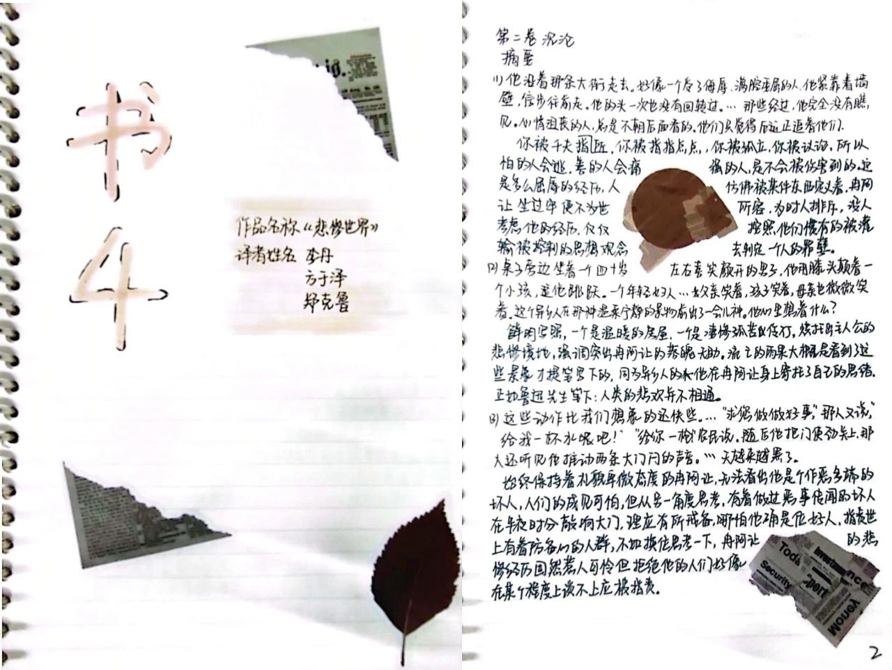 本次活动中同学们品书香之气,享阅读之乐,以笔记的形式分享自己的阅读感受。以书为友,悦读人生。2022级5班钟雯琪笔尖生花,在笔记上留下精美的贴纸与简笔画,采用新颖的形式带领我们走进光明与黑暗交织的《悲惨世界》,展现劳动人民饱受歧视与压迫的不公平待遇。漫步书海,品味人生。2022级6班李香玉记录自己阅读《悲惨世界》的历程,她的笔记向我们展示这本书充满了对人性与社会的思考,以及对正义和希望的追求,笔记结尾分享雨果的经典语录,与我们一同品读经典。以书为伴,与智同行。2022级8班吴婉莹在读书笔记中介绍古希腊戏剧《俄狄浦斯王》,并分析故事发生背景与人物性格,笔记最后引用相关文献作为读书感悟的补充说明。诵读经典,以书润心。2022级8班王怡然字迹工整,赏心悦目,她以《浮士德》为阅读书目,在她看来,浮士德积极进取,既是人类精神的集合体,又是歌德本人的精神代表。
