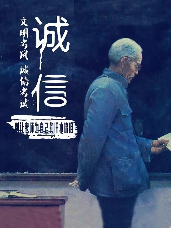 2021级4班杨丹萍以田字方格打底,一横一竖,一撇一捺,每一个笔画都诉说着诚信的重要,画面整体以暗灰色为主,中央以投影方式突出呈现的“诚信”二字,给人以庄重严肃的视觉效果,呼唤学生要自觉恪守诚信品德。一支粉笔,三尺讲台,四季坚守,育万千桃李,2022级6班张云舒以头发花白的老者为主体,朦胧的蓝系风格流露着“风霜染白青丝,粉笔描皱眉眼”的斑驳岁月,她以小视角为切入点,在暗色背景的映衬下“诚信”二字被着重凸显,传递着“文明考风,诚信考试”的庄重诺言。2023级1班文鲁薇的海报以红、黄、蓝作为主色调,作品中央是一只紧握铅笔的大手,赤诚坚定,迸发出无穷力量,大手周围像油墨肆意泼洒,又像水火交织共舞,无畏地奔赴青春梦想,号召学生只有以诚信奠基,才能谱写人生华章。暖色调的灯光照亮前方灰暗的道路,零零碎碎的星光点缀其间。路开始的地方,繁花簇拥;路结束的地方,光芒笼罩。一切的一切,于无形中孕育着生机,给予人向上的力量,她说“勤奋采撷佳绩”“诚信种下希翼”,2023级2班郭程程以“诚”立题,告诫大家诚信应考,以诚为本,同时借“金榜题名”“逢考必过”等美好寄语祝愿大家期末顺利,成功上岸。