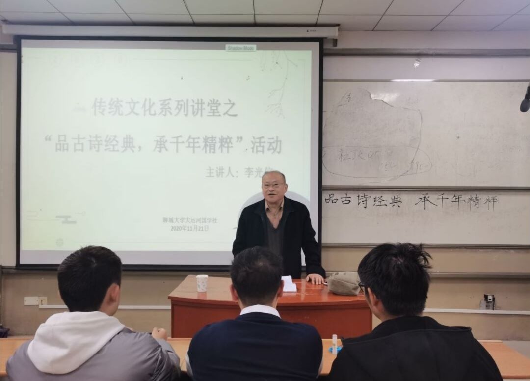 多少黄昏烟雨斜檐,翻开诗篇,勾起一纸江南。为激发同学们学习古诗词的热情,弘扬中华优秀传统文化,11月21日,太阳集团网tyc9728大运河国学社于西校区3#a220举办“品古诗经典,承千年精粹”讲座活动。太阳集团网tyc9728副教授李光信担任主讲人,太阳集团网tyc9728部分学生积极参与。