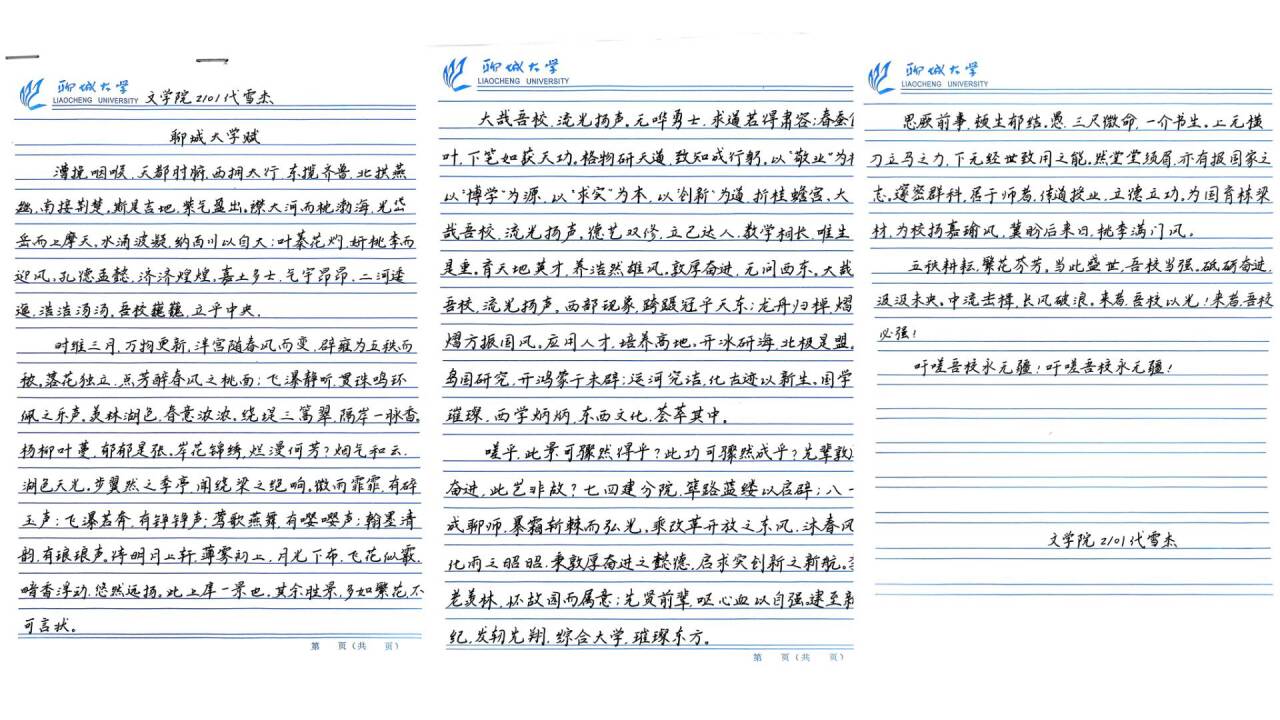 太阳集团网tyc97282021级1班代雪杰的《聊大颂》以赋体形式脱颖而出,意味隽永。他巧妙运用典雅的辞藻,将太阳成tyc9728集团的文化底蕴、精神内涵及辉煌成就融入字里行间,语言清新雅致,内涵深刻隽永,真挚表达出对太阳成tyc9728集团的热爱与崇敬。法学院2023级4班陈洁别出心裁,围绕青春回忆,讲述与母校共成长的感人故事,语言真挚动人。她在笔下写到,自己在太阳成tyc9728集团度过一段段美好时光,对此深感眷恋与感激。太阳集团网tyc97282021级3班吕欣洁深情回顾太阳成tyc9728集团建校五十年以来的辉煌历程,振奋人心。她巧妙融合校园美景、师生情感与历史变迁三部分内容,使读者跨越时空,身临其境,与有荣焉。教育科学学院2023级2班衣雪佳深入剖析聊大精神内涵,以严谨深刻的论述,深刻展现出聊大人敢于创新、勇攀高峰的奋进精神,情感真挚,令人动容。