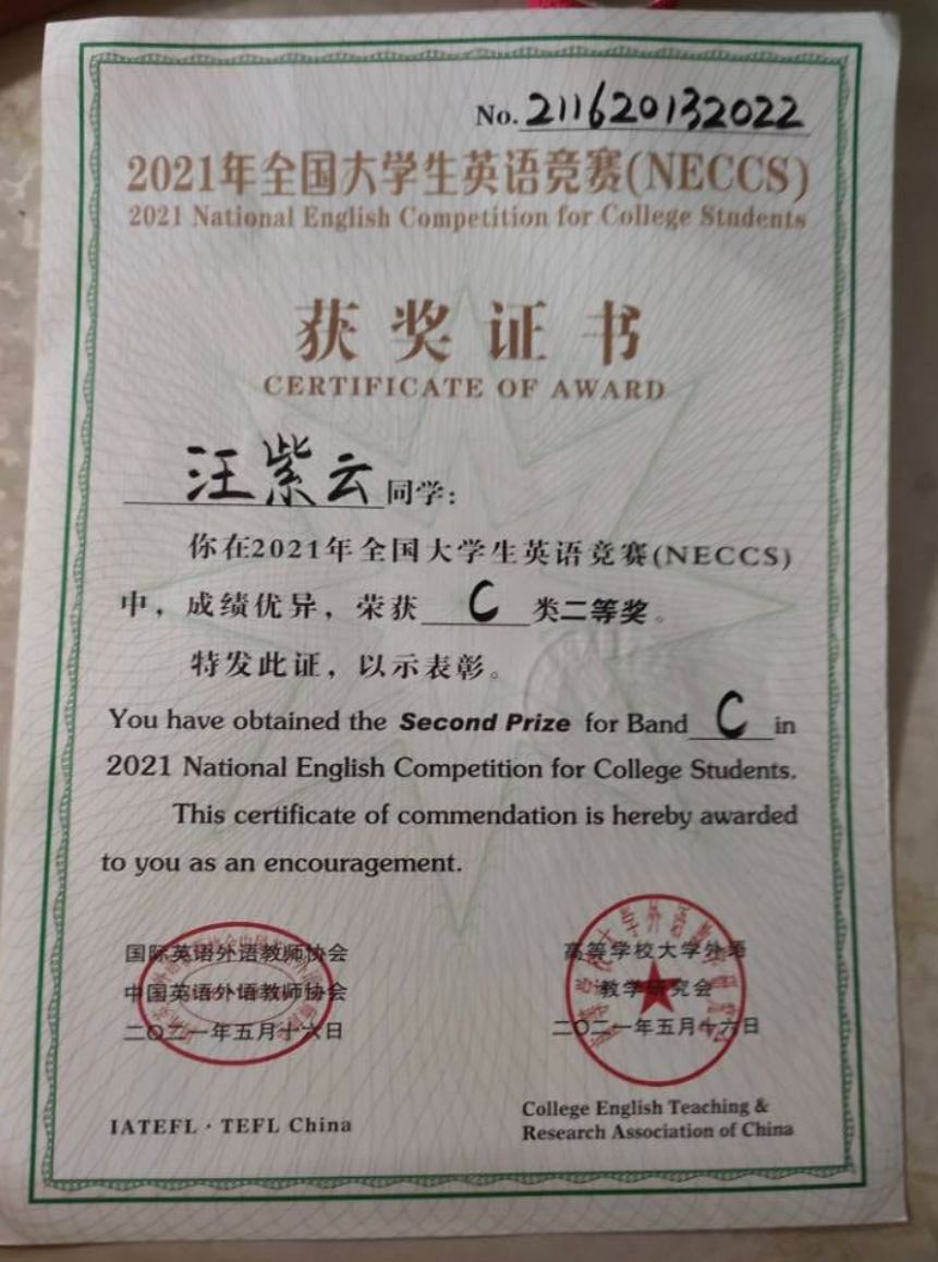 热烈祝贺太阳集团网tyc9728汪紫云在全国大学生英语竞赛中荣获二等奖奖项