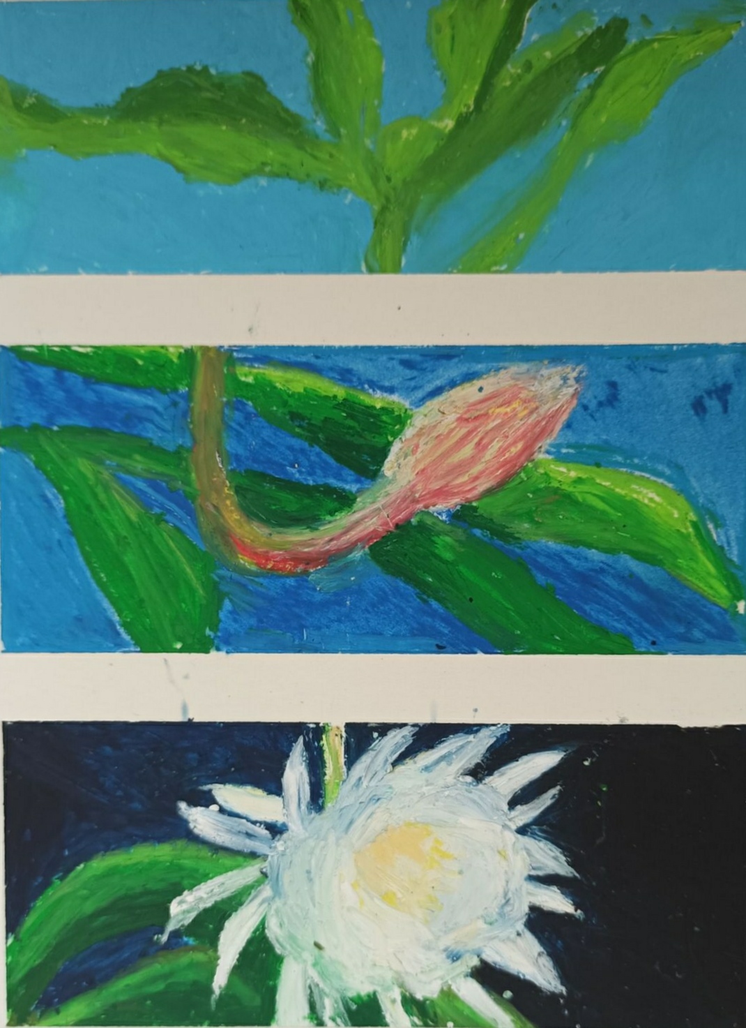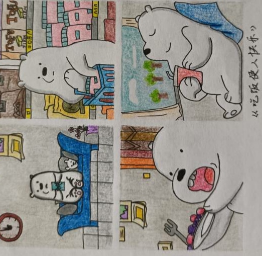 一花一世界,笔下的每一个意象,每一抹色彩都是内心世界的呈现,同学们围绕相关心理主题,借助绘画形式,将诸如“心情从坏到好的变化”“心头感到阵阵暖意”“美好瞬间”等内容生动形象地展现出来。每朵花都将绽放,20级龙方舟的作品用鲜明的色彩搭配和生动的笔触将一朵花的悄然绽放呈现在观者眼前,她写道:“万籁俱寂的夜色里,我也可以拥有自己的美丽。”绽放需要积累,需要等待,相信人生的花一定会开;一餐一饭,都让生活更加幸福。20级11班陈梦心的作品《吃饭使人快乐》以一只白熊为主角,描绘了它从饿到购物吃饱喝足,心里也逐渐感到满足快乐的过程。“胃是最贴近心脏的器官,把胃装满,心脏也就会有充实感,心情也就会变好。”好好吃饭,好好生活是她传达给观者的小哲理。