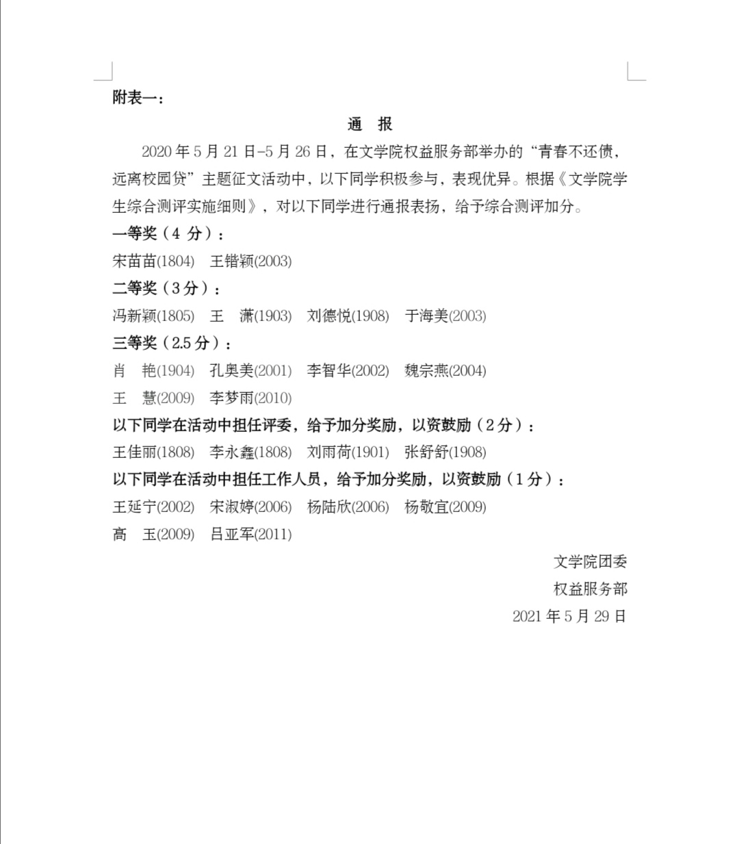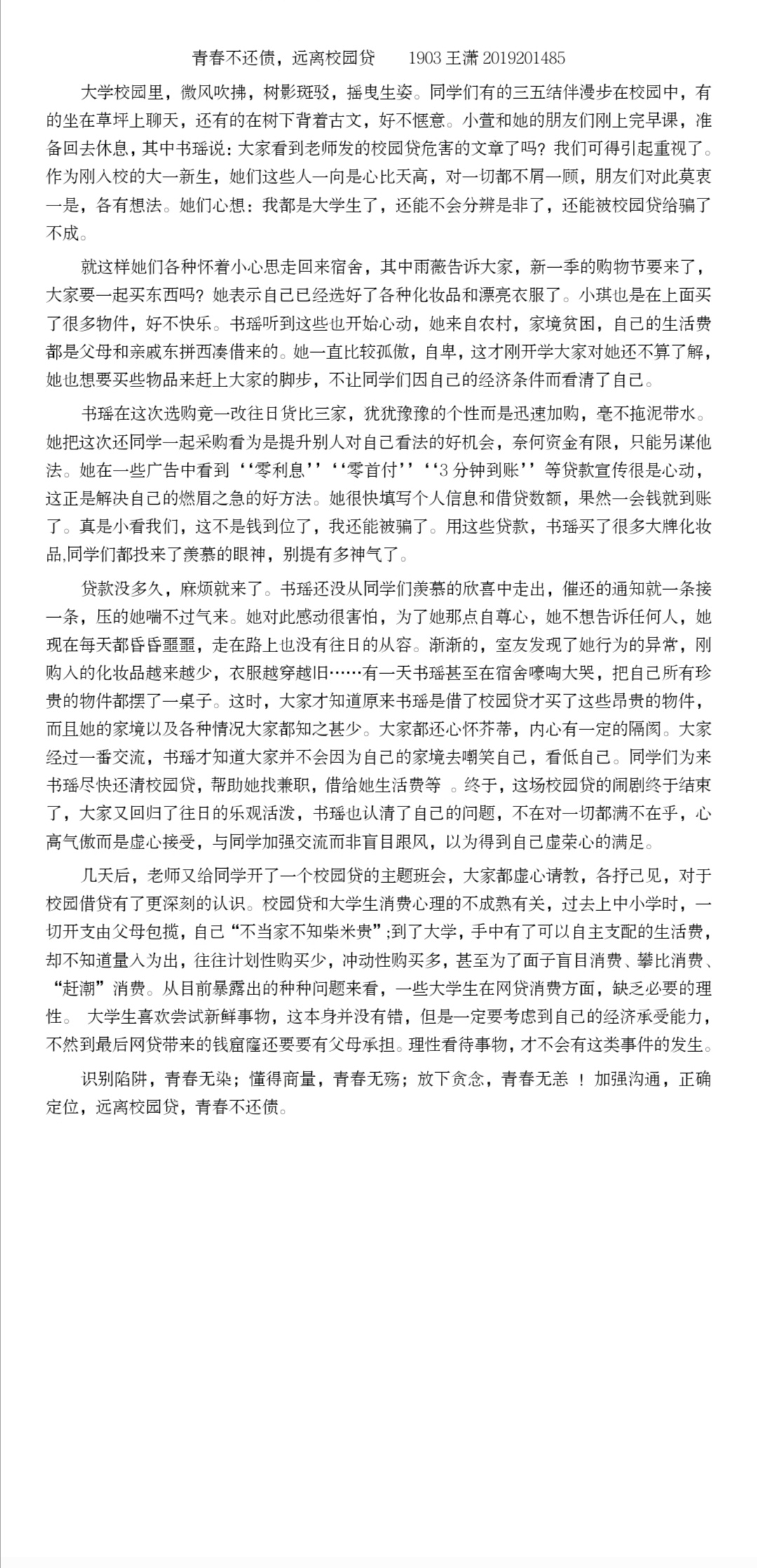 为推动学生深入了解校园贷的危害,提高辨别能力,远离各类校园贷诈骗行为,5月20日至26日,太阳集团网tyc9728权益服务部于线上举办“青春不还债,远离校园贷”主题征文活动。太阳集团网tyc9728部分同学积极参与。