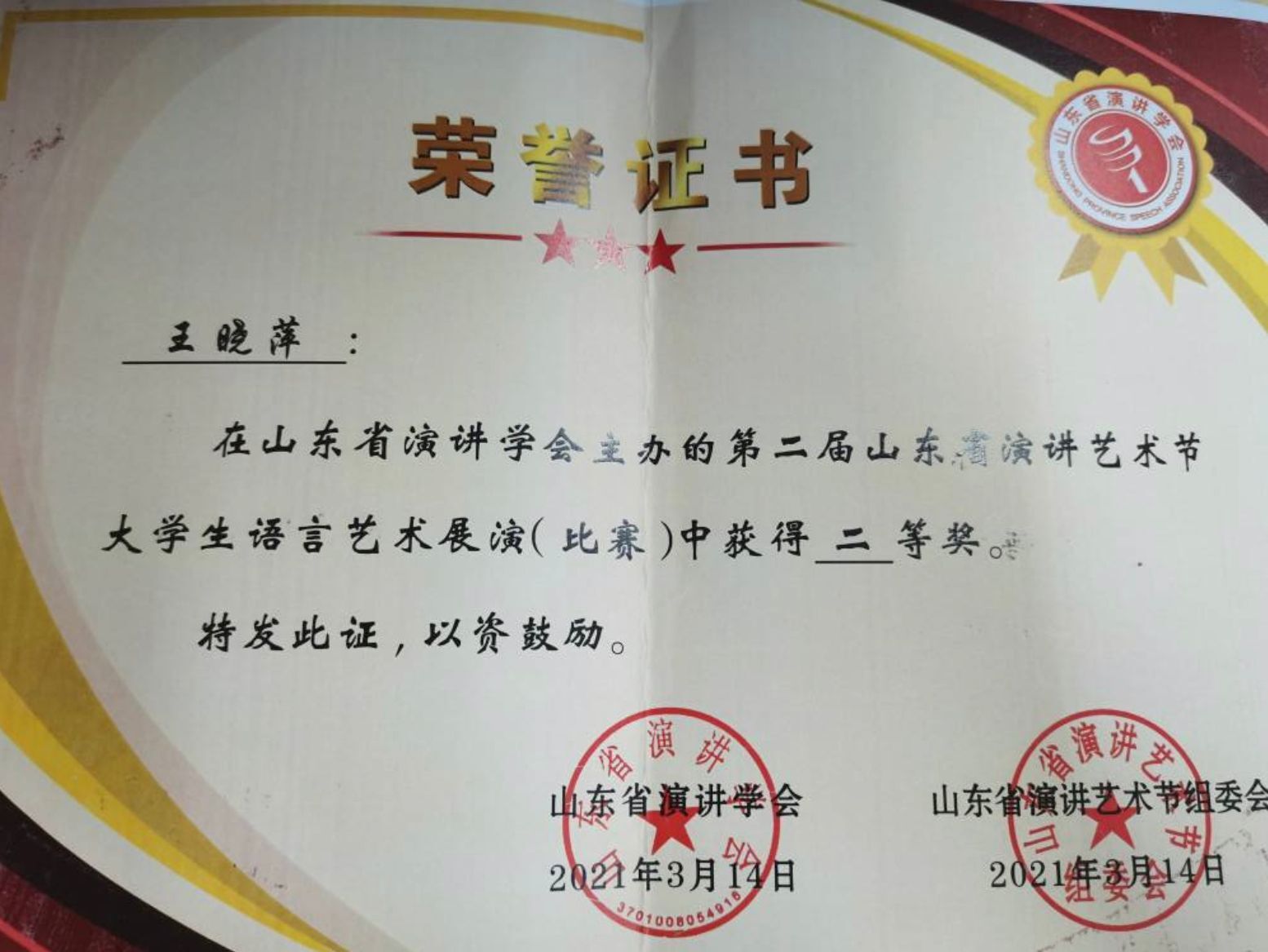 获第二届山东省演讲艺术节大学生语言艺术展演二等奖