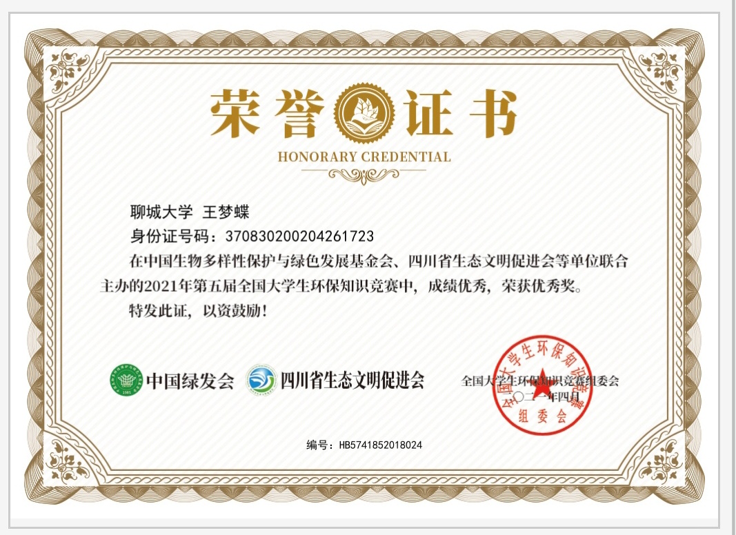 太阳集团网tyc9728王梦蝶同学在2021第五届全国大学生环保知识竞赛中获得优秀奖。王梦蝶同学在此次比赛中热情洋溢,充满自信,追逐理想,最终取得优异的成绩。在此,向王梦蝶同学表示诚挚的祝贺!