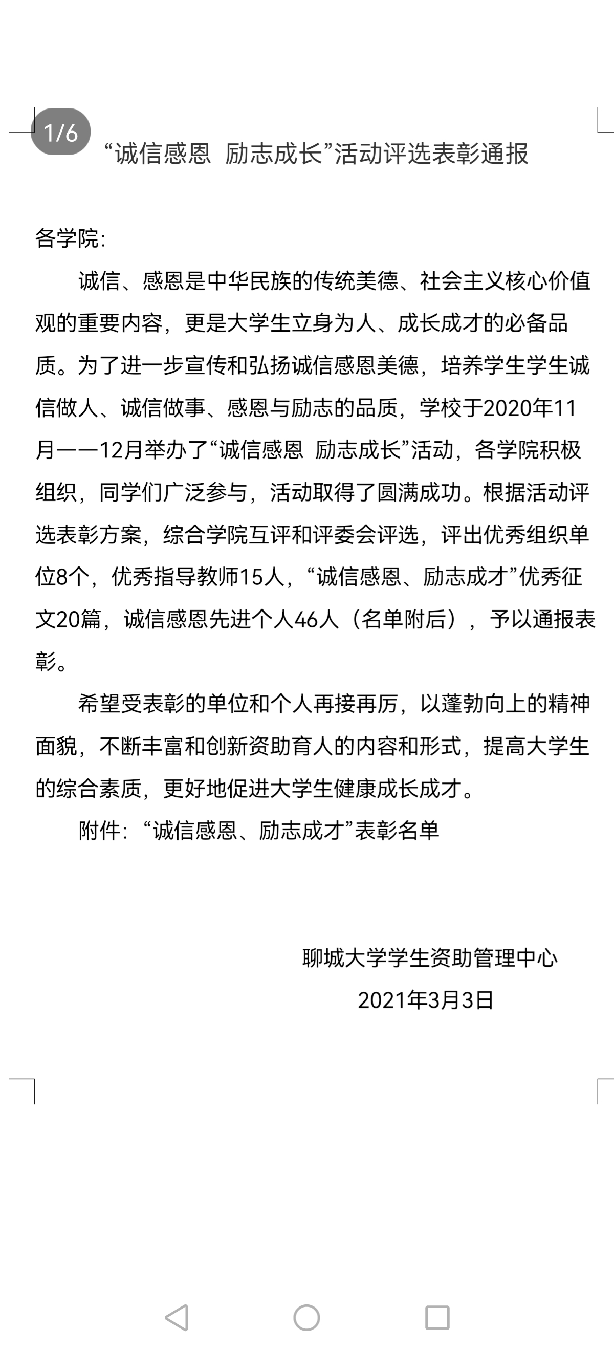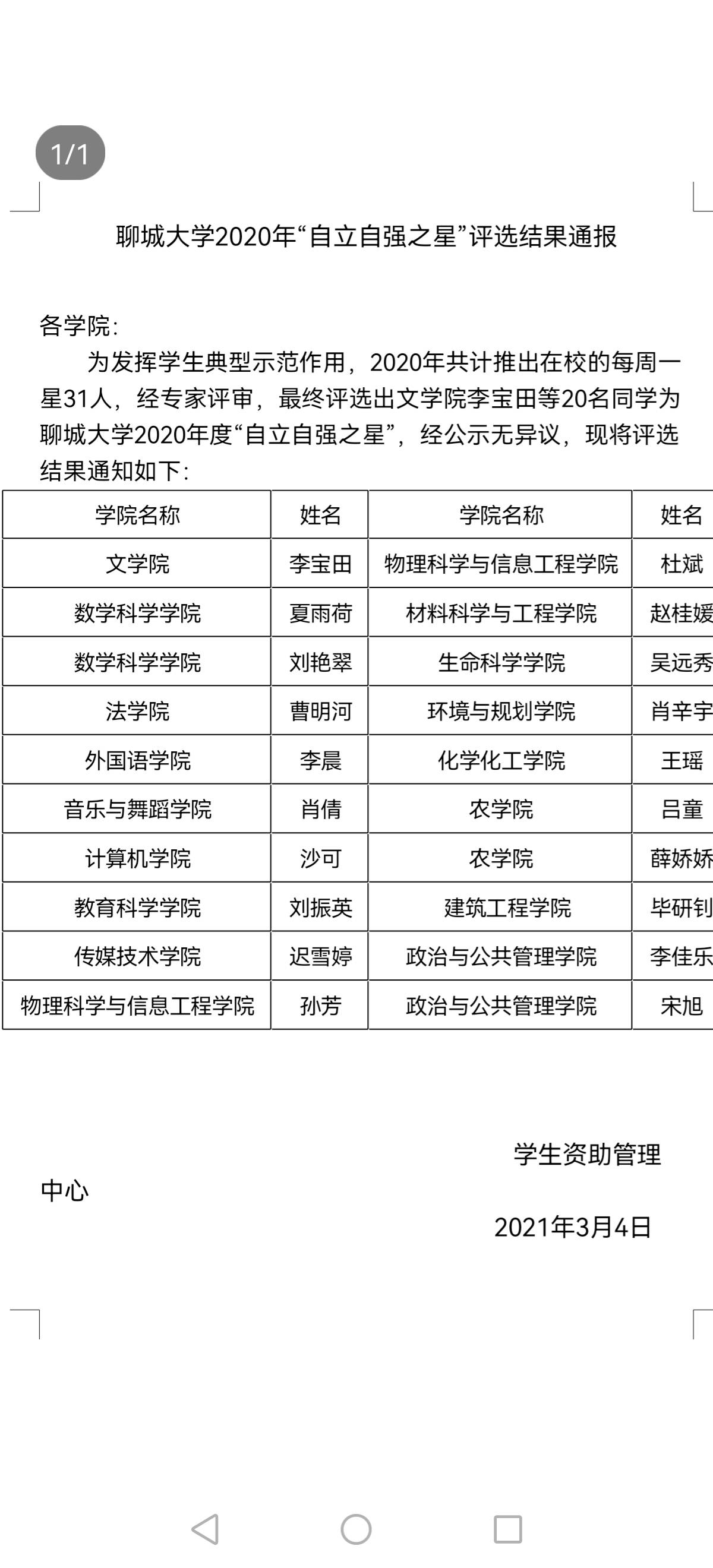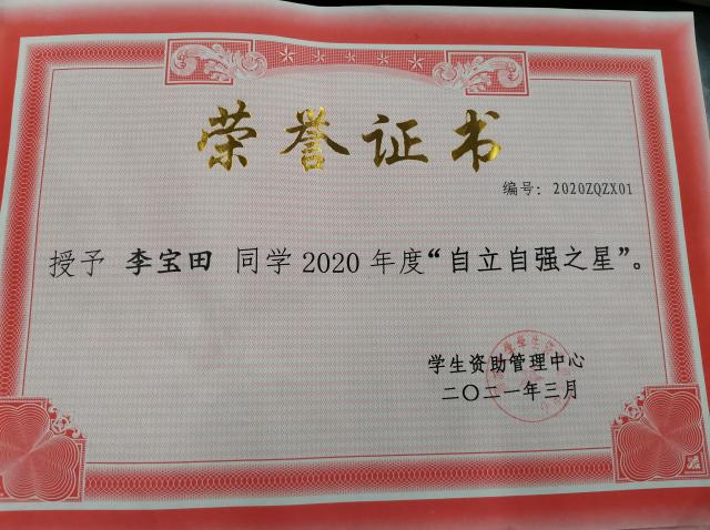 恭喜李宝田同学自立自强、奋发向上,获得太阳成tyc9728集团2020年度自立自强之星