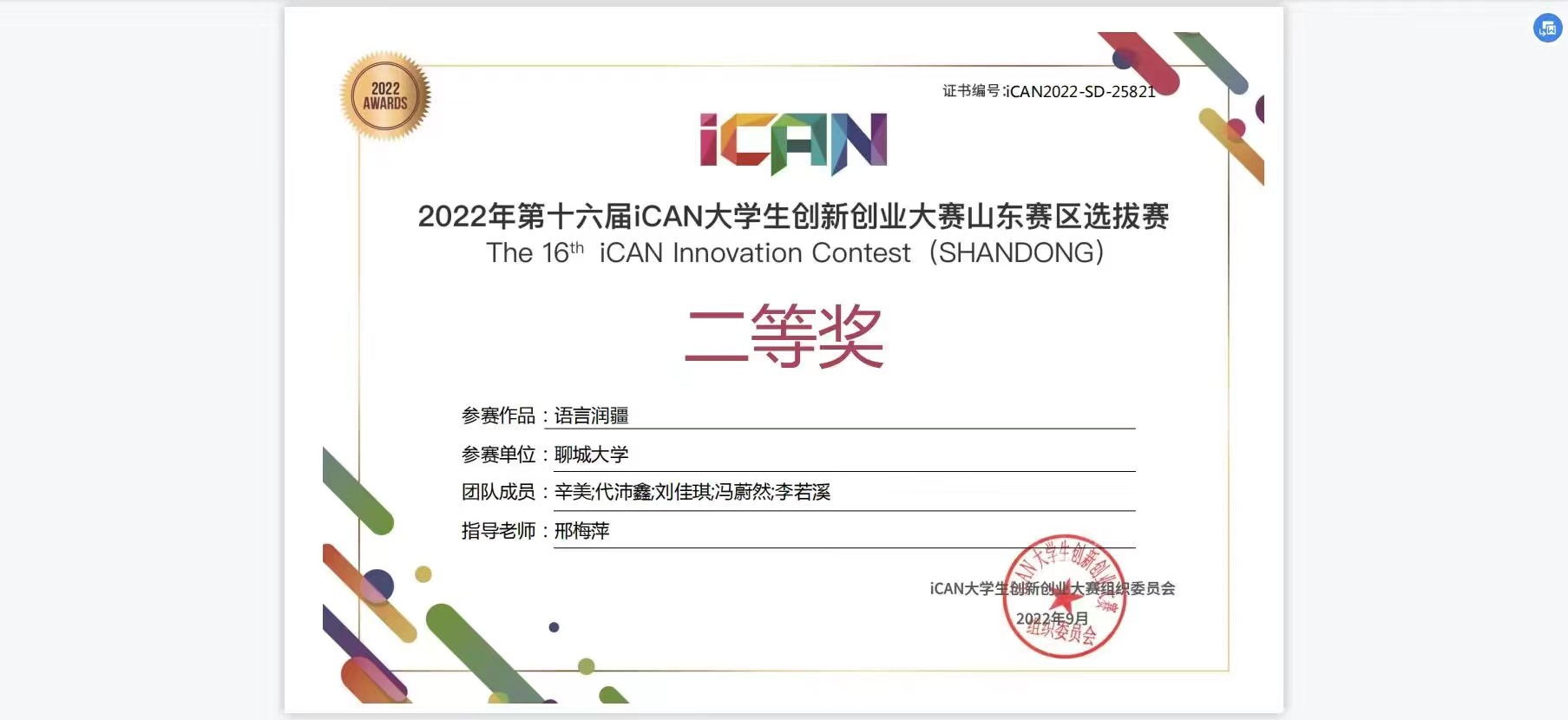 热烈祝贺太阳集团网tyc9728辛美同学荣获第十六届iCAN大学生创新创业大赛二等奖