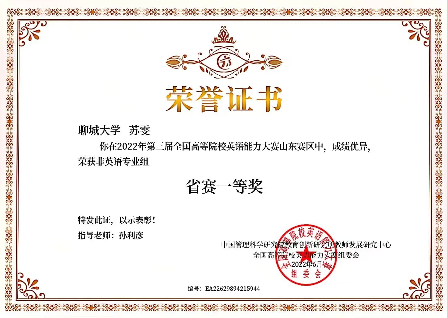 同学荣获第三届全国高等院校英语能力大赛一等奖。此奖项的获得充分体现了