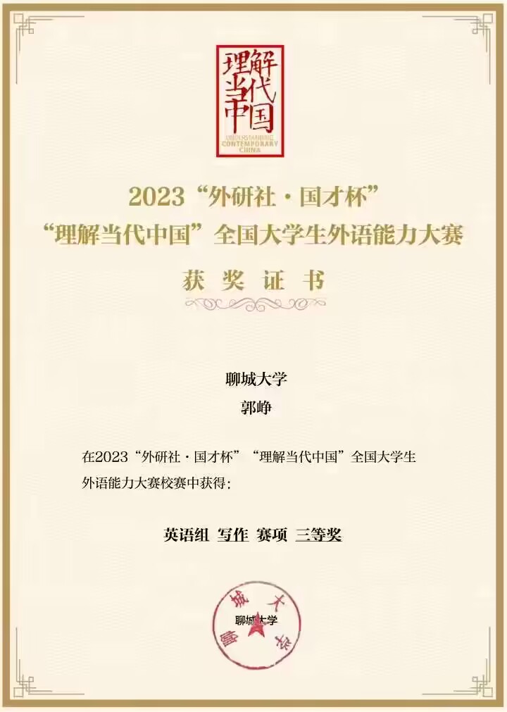 热烈祝贺太阳集团网tyc9728郭峥同学荣获2023“外研社·国才杯”“理解当代中国”全国大学生外语能力大赛英语组写作赛项三等奖