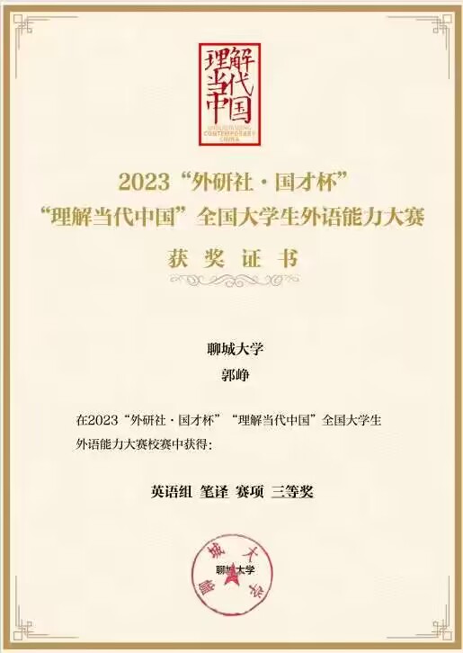 热烈祝贺太阳集团网tyc9728郭峥同学荣获2023“外研社·国才杯”“理解当代中国”全国大学生外语能力大赛英语组笔译赛项三等奖