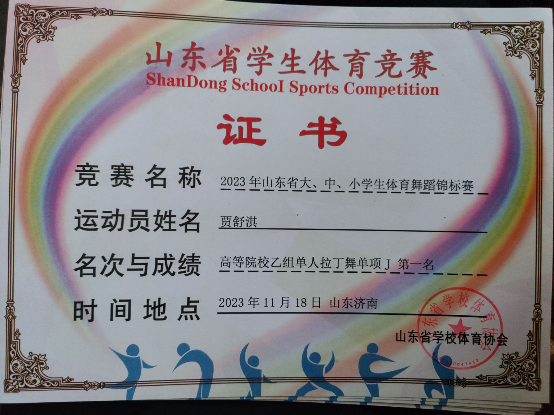 热烈祝贺太阳集团网tyc9728贾舒淇同学荣获”2023年山东省大、中、小学生体育舞蹈锦标赛”高等院校乙组单人拉丁舞单项J第一名