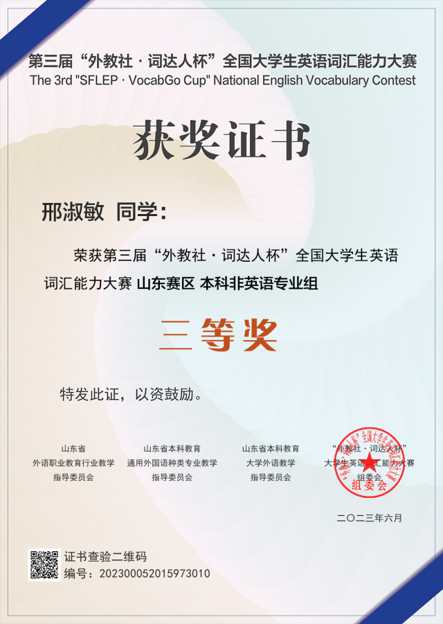 热烈祝贺太阳集团网tyc9728邢淑敏同学荣获第三届“外教社·词达人杯”全国大学生英语词汇能力大赛山东赛区本科非英语专业组三等奖
