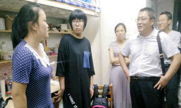 辛业一行来到学生宿舍,详细询问同学们的家庭情况、入学报到情况和对学校环境的适应情况。在学生宿舍,辛业与同学们亲切沟通,并嘱咐同学们要互相关心、互相学习,共同进步。解方文着重强调了安全问题,叮嘱同学们注意用电,杜绝传销。同学们感谢老师的关怀,并表示积极适应大学生活、相互团结。访询活动结束后,宿管部成员向老师们递交新生入住情况报表,对新生入住情况作简要报告。