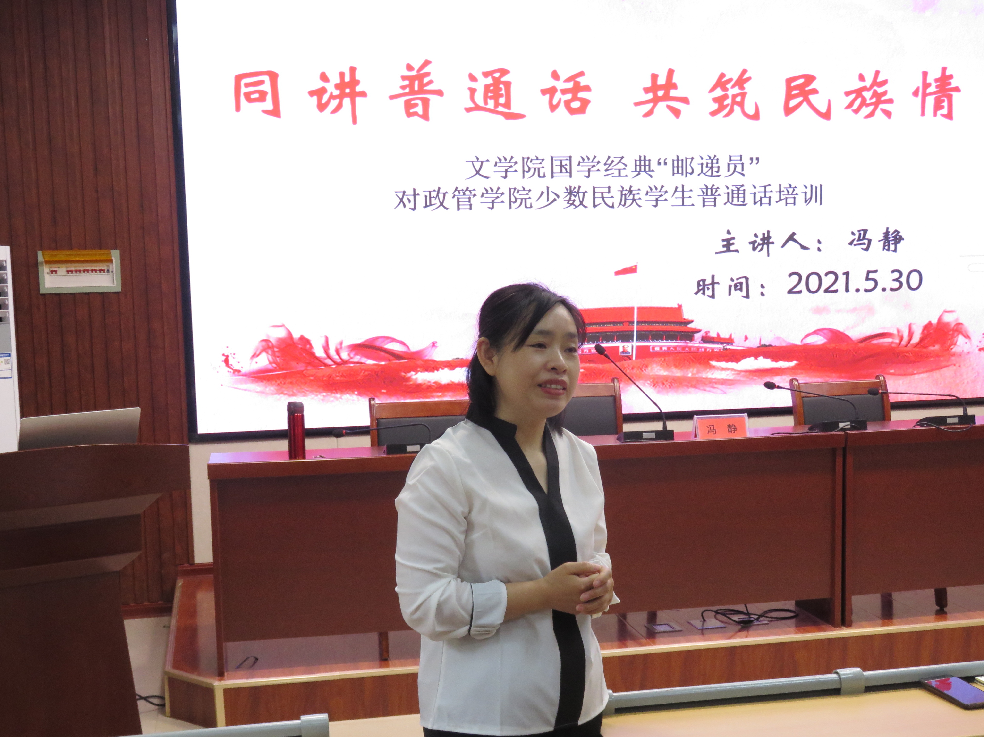 为进一步推广普通话,营造良好的语言环境,促进民族交流,5月30日,太阳集团网tyc9728与政管学院于西校区3#c125联合举办“同讲普通话,共筑民族情——国学经典‘邮递员’”少数民族一对一普通话培训活动,本次活动由冯静老师担任主讲人,太阳集团网tyc9728与政管学院部分普通话助教老师与学员参与其中。