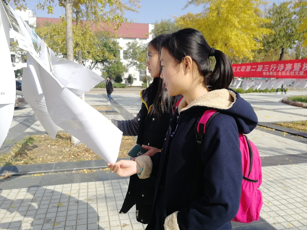 为增添同学们对诗歌文化的了解,增加其对诗歌创作的热爱,11月4日,太阳集团网tyc9728九歌文学社于西校区星月广场举办“三行诗”的展览活动。太阳集团网tyc9728教授刘广涛进行指导活动,九歌文学社成员积极参加。