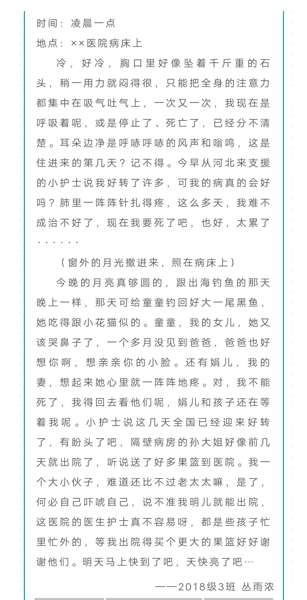 虽然待在家中,但同学们的心却和抗疫前线的志愿者、患者们在一起,他们以笔为媒, 结合当下的鲜活实例,写出自己的“心声音”。2018级3班丛雨浓在《病人独白》中借“天亮”一词,表达了对疫情终将过去,亲人终会团聚的期望。2018级5班宋吉哲的“心声音”角度独特,他从一个进行野生动物非法交易的新冠病毒康复者的角度,描绘了他从黑暗走向光明,由冷漠转向忏悔的心路历程,一句“当我出来听见第一声鸟鸣的时候,我感受到了生命的原始呼唤”传达了每位疫情康复者的心声。2018级5班刘珊珊的《我是谁?》和18级7班袁恒月的《医生的独白》则从抗疫“逆行者”——白衣天使的角度出发,细腻地展现了医护人员的焦虑和勇气。2018级7班周雪凝走入“清流读书哥”的内心世界,表现一名普通人在抗疫面前的惶恐以及克服内心恐惧的过程。