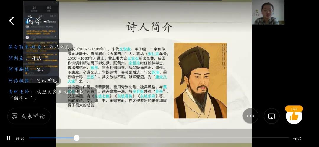在国学课堂上,李昕通过用“发愤识遍天下字,立志读表遍天下书”的课前小故事,引出此次国学课堂的主讲人物—苏轼。随后,李昕从其生平、文学作品及其风格等多方面为大家详细介绍了苏轼。李昕朗读《念奴娇•赤壁怀古》和《蝶恋花•春景》,让同学们体会到了同一诗人的豪放与婉约不同风格特色。接着便对《惠崇春江晚景》从注释、翻译等多方面为同学们做了诗歌鉴赏,在此过程中教授同学们赏析诗歌的方法。最后,通过视频进一步了解了苏轼起起伏伏的一生,加深了同学们印象。