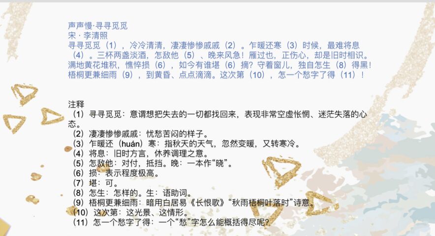 本次线上支教由志愿者刘雨荷担任主讲人。她先向同学们播放根据经典诗词《声声慢》所改编的歌曲,歌曲凄美婉转,同学们沉浸其中。在讲述何为“闺怨”诗后,同学们产生何为“爱情”的疑问,老师向他们举父母的例子,同学们顿时明白。学习古诗除却诵读,更要深入体会诗句所蕴含的感情。孔令慧将《声声慢》详细拆分,逐句赏析,帮助同学们体会其中情感,有的同学理解后踊跃参与朗诵,声情并茂地演绎诗词。为加深同学们对于闺怨诗的感情体会,她还重点讲解李商隐、李清照等著名诗人的生平经历,并为同学们搜集中华历史上美好的爱情故事,同学们被其中的美好所打动,纷纷用画还笔原自己心中爱情故事的美好景象。