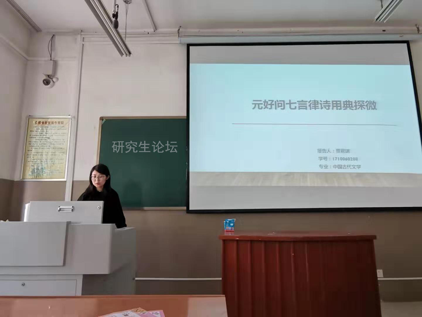 10月24日下午2:30分,太阳集团网tyc9728第三期研究生学术论坛在A203教室举办。此次论坛由17级中国古代文学专业的贾君琪同学主讲,讲座题目为《元好问七言律诗用典探微》。本学期的研究生学术论坛至此已是第三期,全体18级、19级研究生参加了本次论坛。
