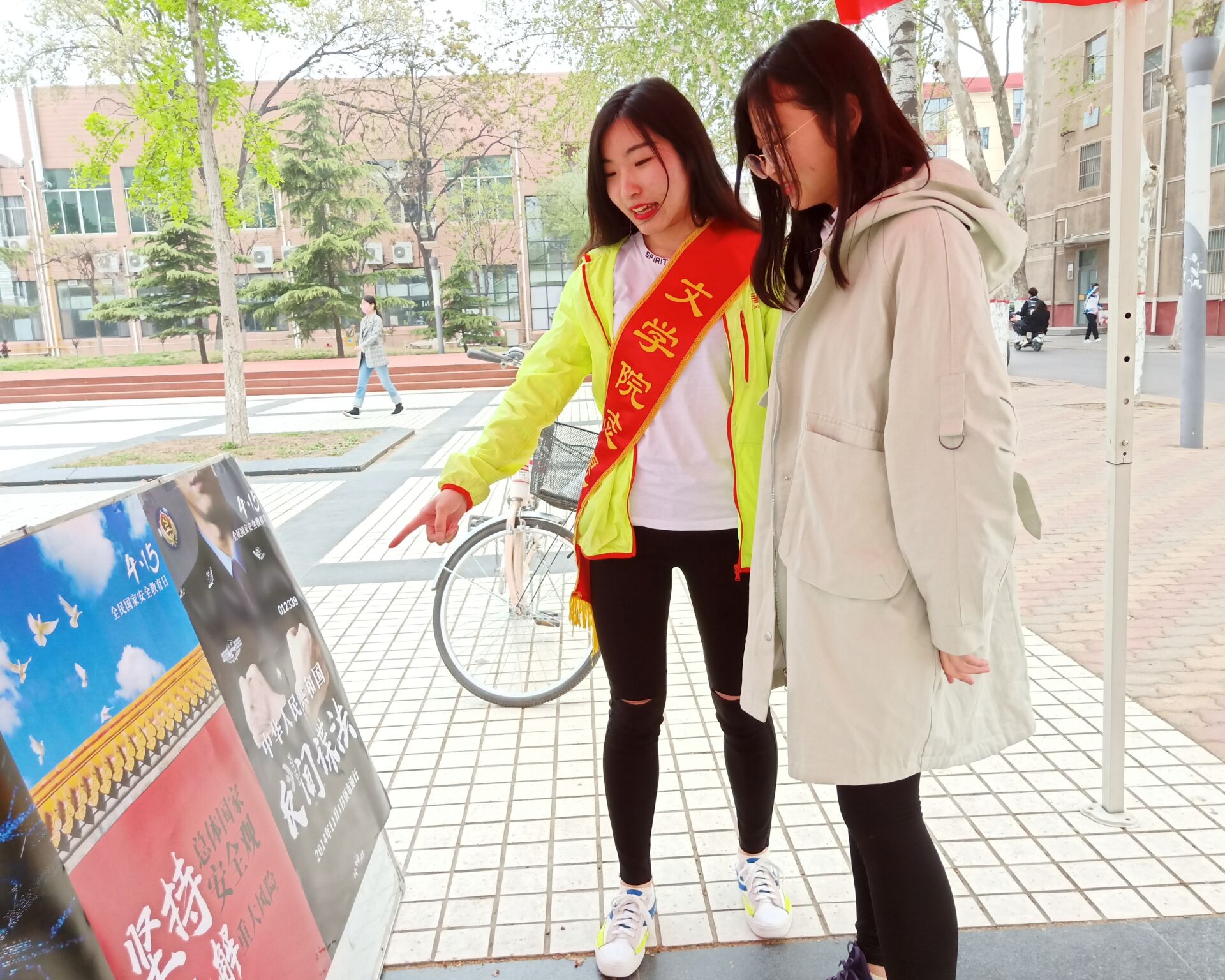 国家安全人人有责,维护国家安全人人可为。此次主题活动分为两个部分:权益部成员对路人进行随机提问并向他们讲解有关知识,帮助同学们了解国家安全的定义和对国家利益的重要性。随后,权益部组织人员带领同学们浏览安全教育展板,了解相关法律和依法维护国家安全的途径,并向同学们讲述有关违法犯罪的案例,敲响同学们心中的警钟。同学们纷纷驻足,在横幅上签名,表示愿意为国家安全建设贡献自己的力量。