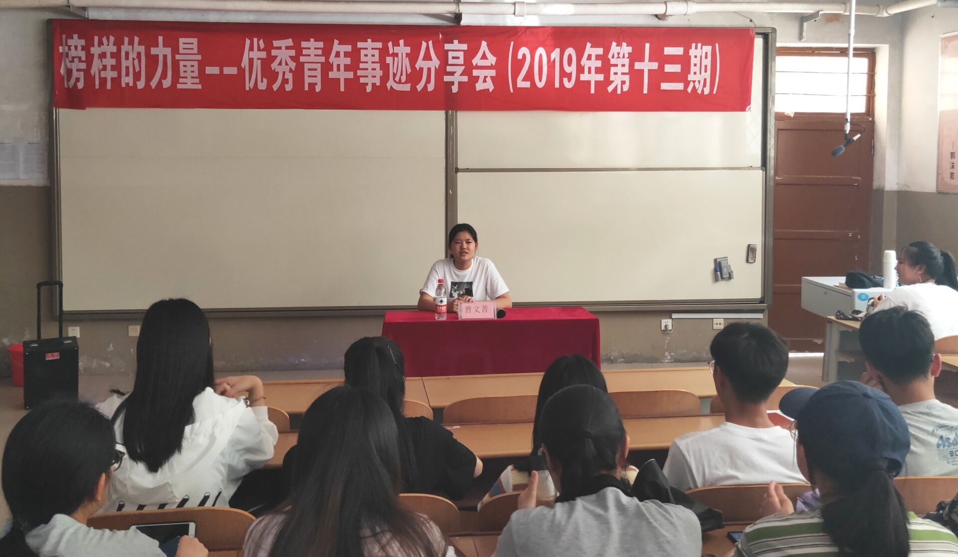 为激励大学生积极进取、努力拼搏,6月2日,由太阳成tyc9728集团校学生会主办,太阳集团网tyc9728承办的2019年第十三期“榜样的力量——优秀青年事迹分享会”于3#A116举办,诚邀太阳集团网tyc97282017级校级优秀学生、校级优秀学生干部、优秀团干部标兵曹文菁担任主讲人。太阳集团网tyc97282018级部分同学积极参与。