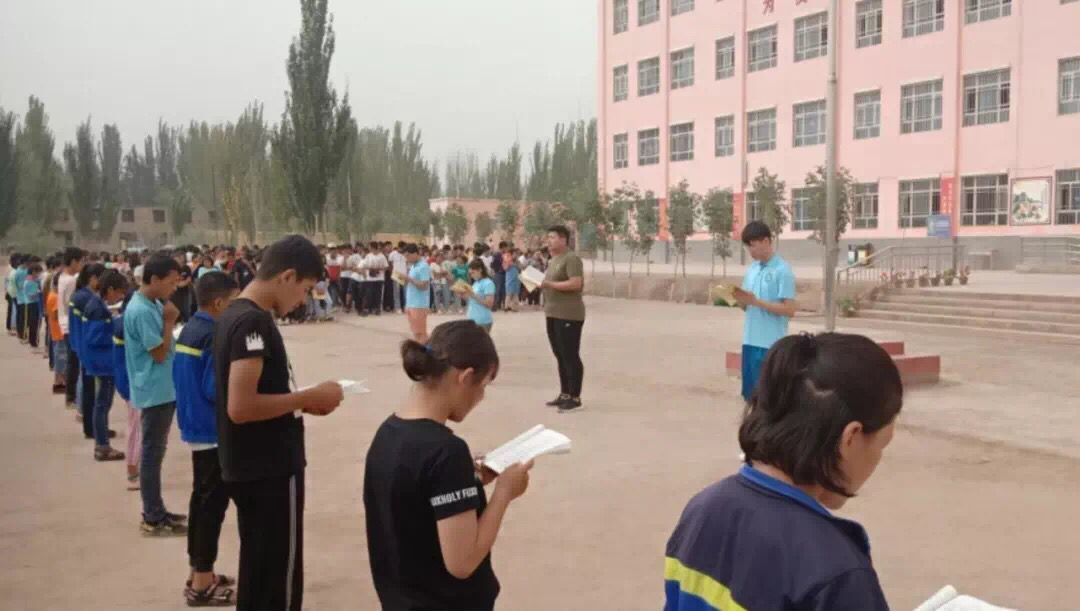 7月26日,太阳成tyc9728集团国学经典“邮递员”志愿服务队组织新疆喀什地区伽师县英买里乡返校学生,在英买里乡中学操场上开展“千人诵读经典,学习经典文化”活动。