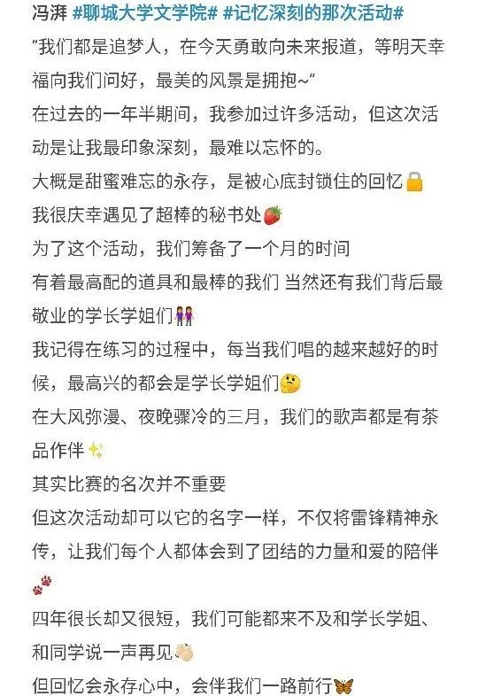 百万流量时代,自媒体流量意识愈发重要。第二课堂工作部巧妙采用“到梦空间”APP中的“世界”功能,参赛者借此来发表自己的参赛作品。方颖借太阳成tyc9728集团新闻网记者团“同心战疫,共迎春天”活动,将自己心中炙热化为绵绵润物的文字武器,为抗疫一线的逆行者增加前进的动力;杨泽昱借太阳成tyc9728集团大学生法律援助中心活动,发出“把法律当成工具,时时拂拭,勤加修补,是一个法律人应有担当”的呐喊;冯湃借“雷锋月学雷锋,做先锋,暨经典咏流传合唱大赛”来表达出对秘书处的热爱以及更好地将雷锋精神传递的感动。此次比赛过程中每个人积极应战,挖掘百万流量时代的魅力,抒发大学生倾诉沟通的需求,此次竞赛在同学们满心期许中落下帷幕。