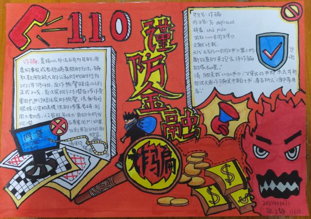 严防电信诈骗,共创美好明天。本次“防诈骗”手抄报活动得到广大同学的积极响应,共收到作品80件。在征集作品过程中,同学们积极参与,用心创作,作品围绕防范电信诈骗进行设计制作。陈丹同学以漫画手法夸张的表现出诈骗罪犯为金钱而残忍吞噬普通群众的画面,充分体现出对电信诈骗行为的深刻理解;岳蓓同学以黑红为主调,在“骗局”二字中融入流着鲜血的眼睛,并用黑色弯曲的线条向白纸的空白处蔓延,突出诈骗罪犯的丑恶嘴脸和电信诈骗的恐怖性,展现出其对校园诈骗的深恶痛绝。经过评审,共选出16张优秀作品。活动后,学院通过公示栏对部分优秀手抄报作品进行了公开展示,以此警示教育更多同学,提高他们防范校园诈骗的意识。