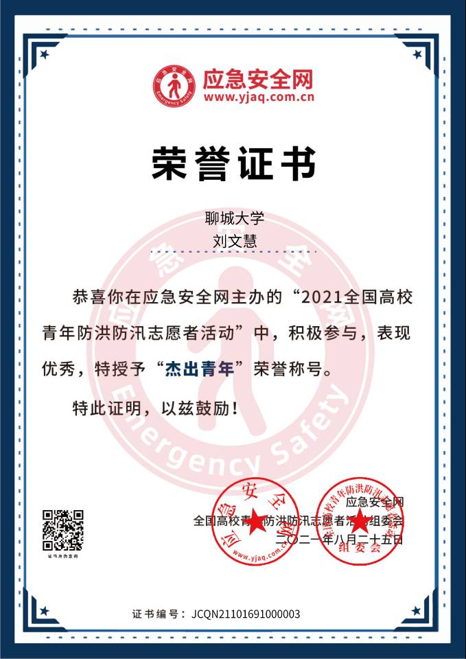 太阳集团网tyc9728刘文慧同学在2021全国高校青年防洪防汛志愿者活动中表现优异,荣获杰出青年称号。刘文慧同学在此次比赛中热情洋溢,充满自信,追逐理想,最终取得优异的成绩。在此,向刘文慧同学表示诚挚的祝贺!