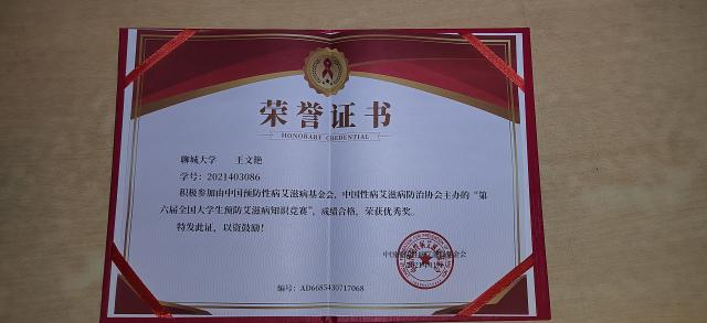 我院王文艳同学在第六届全国大学生预防艾滋病知识竞赛中荣获二等奖。此次获奖充分展现了王文艳同学在日常学习生活中的不懈努力,我校为有这样的学生而感到骄傲。在此,向王文艳同学表示诚挚的祝贺,同时祝愿她乘风破浪,再获佳绩。