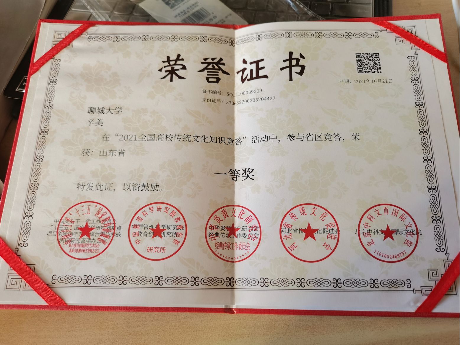 我院辛美同学荣获全国高校传统文化知识竞赛一等奖。优异的成绩证明辛美同学不仅知识面广泛,而且心系社会、关心他人。辛美同学优异的成绩也为学校的建设争光添彩。在此,向辛美同学表示诚挚的祝贺。